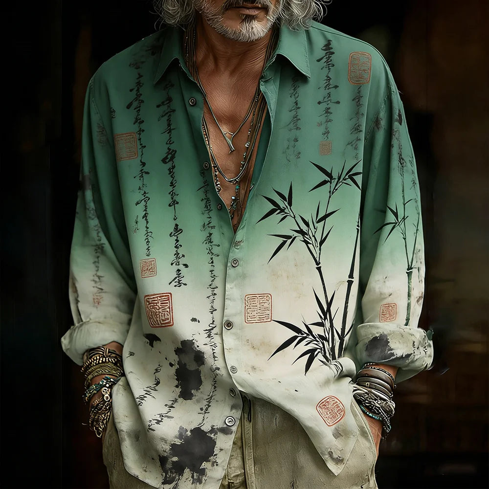 This shirt features beautiful bamboo artwork combined with flowing calligraphy patterns, creating a unique ink-art aesthetic across the fabric. The design reflects traditional East Asian artistry while maintaining a contemporary fashion edge.